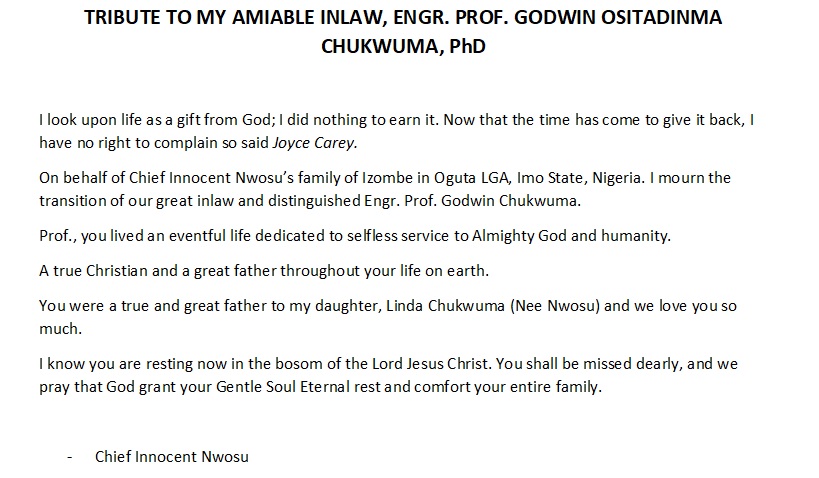 TRIBUTE TO MY AMIABLE INLAW, ENGR. PROF. GODWIN OSITADINMA CHUKWUMA, PhD