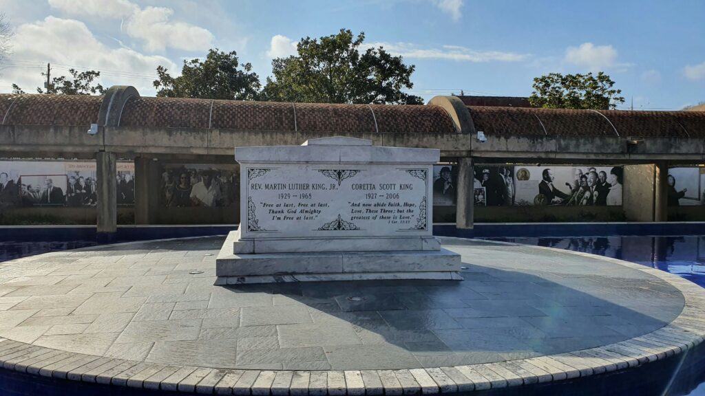 In Atlanta, Dr. King’s first funeral service was conducted at Ebenezer Baptist Church after lying in state at Spelman college. Over 1300 people attended the private services including politicians, civil rights leaders, movie stars, writers, athletes, and musicians. After the services concluded, Dr. King was placed into a humble farm wagon and a procession began from Ebenezer Baptist Church to Morehouse College where the public service would be held. The procession marched in silence while occasionally singing freedom songs; numbers of attendees at the procession vary by source, but are estimated to be 100,000 to 200,000 that accompanied Dr. King to the public service. Following the public service, Dr. King was brought to South-View cemetery where he rested until 1970 when a mausoleum was built. A reflecting pool and eternal flame were added to the site in 1977 and in November 2006, Dr. King’s wife, Coretta King was laid to rest next to him.
